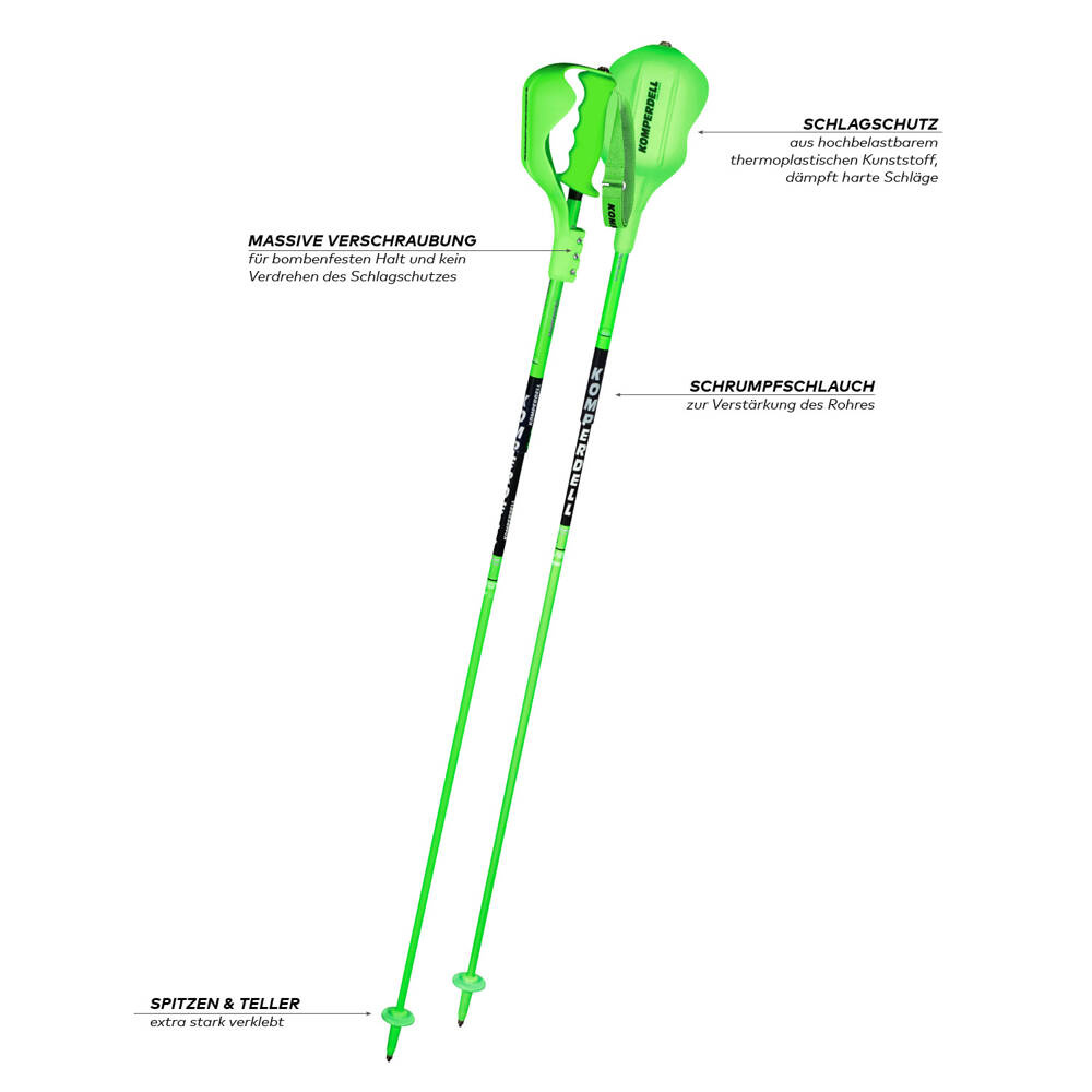 The carbon shaft, specifically designed for ski races, withstands high levels of stress while ensuring low weight and maximum performance. Additionally, it is equipped with a shrinking tube for reinforcement of the pole and to prevent breakage when hitting the gate. The high-quality technical grip impresses with its punch protection made of highly resistant thermoplastic resin that absorbs hard impacts. The solid screw joints of the individual parts ensure a bomb-proof hold and prevent the punch protection from twisting. Moreover, the tip and race basket are tightly glued together to keep everything in place even under the high levels of stress occurring during ski races. Furthermore, its distinctive green-black design makes it stand out from the crowd. This pole, combined with Worldcup equipment made of high-strength materials and carefully produced, is a must for ambitious racers who value top quality.