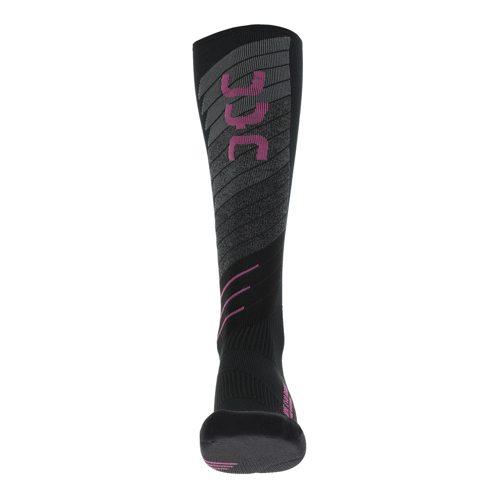 Uyn Woman Ski Evo Race One with their ergonomically shaped footbed, various protective and supportive areas such as the ankle and Achilles tendon, as well as shock-absorbing elements, they fit perfectly. High-quality merino wool also guarantees maximum wearing comfort and effective thermal insulation at all times. This is combined with zerocuff technology ensuring amazing comfort and hold.
