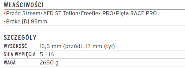 Wiązania Freeflex ST 16 wyposażone są w przód Stream i piętę RACE PRO. Duży zakres regulacji i aerodynamiczna konstrukcja zapewniają bezpieczeństwo i maksymalne osiągi.